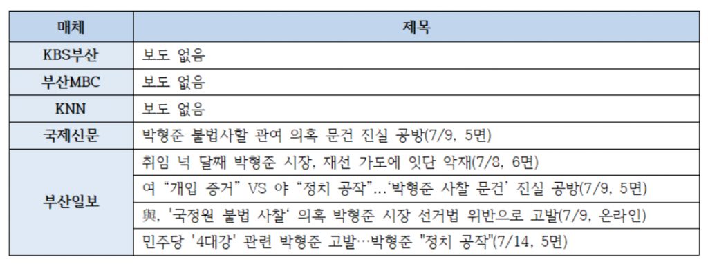 부산일보는 <취임 넉 달째 박형준 시장, 재선 가도에 잇단 악재>(7/8, 6면)에서 ‘불법사찰’, ‘요즈마펀드 의혹’, ‘엘시티 공익 환원 진정성’ 등을 언급하며 타 지역언론보다 적극적 보도를 보여줬지만, 이 모든 사안을 박형준 시장의 재 선과 연결해 ‘악재’라 단정했습니다. 이어 <민주당 ‘4대강’ 관련 박형준 고발…박형준 “정치 공작”>(7/14, 5면)에서는 박형준 부산시장의 “이번 사안을 대선국면을 앞두고 전략적 요충지인 부산을 공략하기 위한 여권과 국정원의 정치공작으로 규정”한다는 반박입장을 자세하게 보도했습니다.