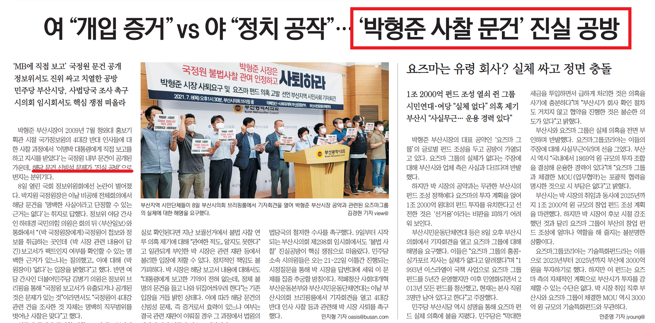 이번에 추가 문건이 공개돼 다시 ‘진실’ 규명에 관심이 모아지고 있는 가운데, 지역언론은 ‘박형준 시장의 불법사찰 개입’을 어떻게 보도했을까요?