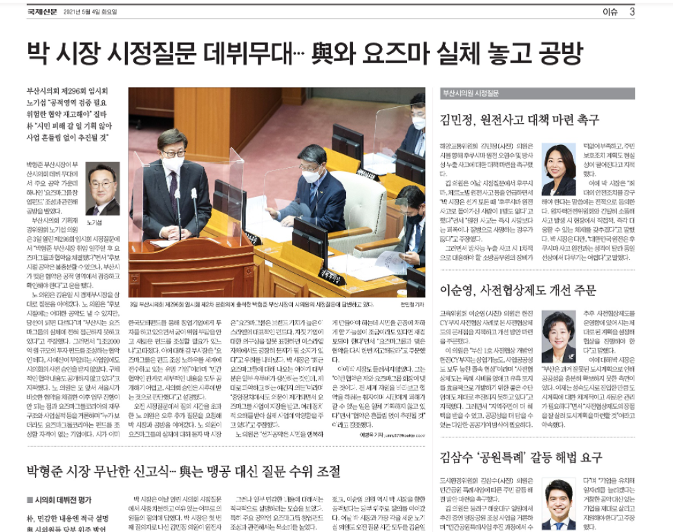가장 적극적인 보도를 보여준 건 국제신문이었습니다. 국제신문은 5월 4일 3면 전체를 할애해 임시회에서 어떤 질의가 나왔는지 의원별로 소개했고 박형준 시장의 답변과 공방, 평가 등을 상세히 보도했습니다. 5일에도 <재개발 규제 완화 추궁하자 박 시장 “공급확대 위해 필요”>에서 재개발 재건을 완화를 비롯한 청사포 풍력발전, 동백전 등 의원별 질의를 소개했습니다.