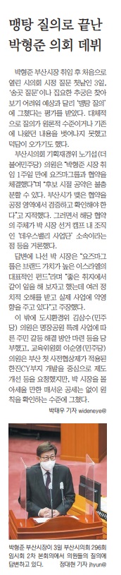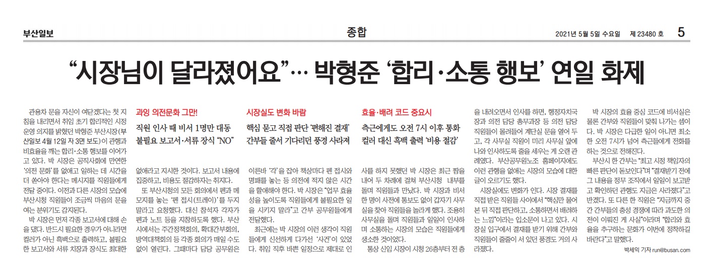 한편 시정 질의 기간에 부산일보에서만 전한 소식도 있었습니다. 5월 5일 <“시장님이 달라졌어요”…박형준 ‘합리‧소통 행보’ 연일 화제>인데 박형준 시장이 관행과 비효율을 깨는 합리‧소통 행보를 이어가고 있다는 미담성 기사였습니다. 필요한 경우가 아니면 컬러가 아닌 흑백으로, 불필요한 보고서와 서류 치장과 장식을 없앨 것, 모든 회의에서 팬과 메모지를 없애고 개인이 지참할 것 등 박형준 시장의 행정 지시를 소개한 내용이었습니다.