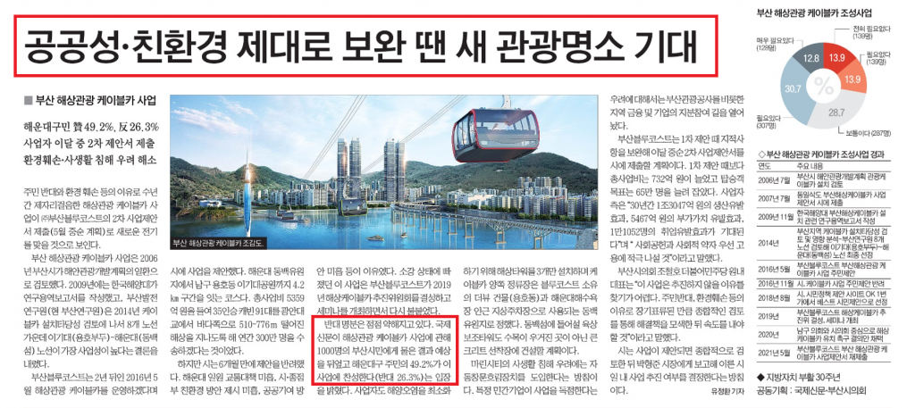 이미 국제신문은 부산블루코스트가 사업 수정안을 제출하기 전부터 해상케이블카 문제를 이슈화한 바 있습니다. 4월 26일자 국제신문 1면 <장기 표류사업 100여 개…부산발전도 공회전>에서 국제신문과 부산시의회가 ‘지방자치 부활 30주년 공동기획’으로 ㈜도시와공간연구소에 의뢰해 부산시의 대표적인 장기 표류 사업 100여 개 중 주요 사업 12개에 대한 시민 1000명의 의견을 물은 결과를 소개한 겁니다. 저출산 극복, 가락요금소 통행료 무료화 추진, 더파크 동물원 정상화, 아시아드주경기장 활용, 청년주택 및 민간공공임대주택사업 등 12개 사업에는 해상케이블카 사업도 포함시켰는데, ‘사업 필요성’에 대해 해상케이블카는 12개 사업 중 11위를 차지했습니다. 기사에서는 ‘사업의 필요찬반’에서는 필요하다는 의견이 43.5%로 필요없다(27.8%)는 의견을 앞섰다고 강조했습니다.