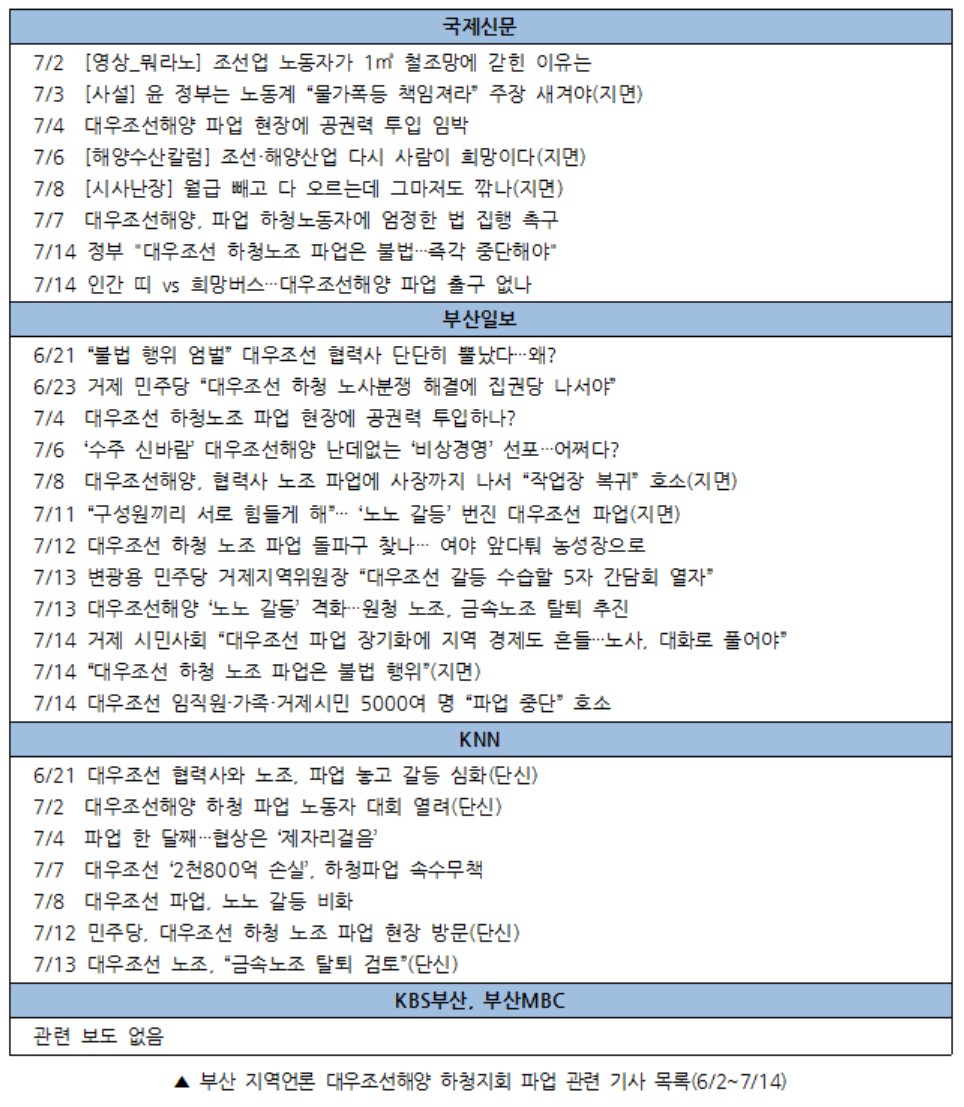 지역언론 중 국제신문의 외부기고를 제외하고는 조선업의 70%가 비정규직인 산업현장, 다단계로 쪼개어진 하청구조, 저임금 등이 발생하는 구조적 상황을 짚은 기사는 단 한건도 없었다. 국제신문 <조선업 노동자가 1㎥ 철조망에 갇힌 이유는>(7/2)을 제외하고는 파업 당사자를 직접 취재한 기사도 찾아볼 수 없었다.