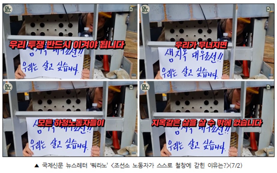 국제신문의 대우조선해양 하청지회 파업소식 관련 기사는 총 8건으로 대부분 온라인 기사였고, 지면에 게재된 기사는 주로 사설, 칼럼, 외부기고 등 의견기사만 있었다. 파업의 자세한 이유와 당사자 취재는 부족했다. <조선업 노동자가 1㎥ 철조망에 갇힌 이유는>(영상, 7/2)에서만 하청지회 노동자의 파업이유를 자세히 다뤘을 뿐이다. <대우조선해양 파업 현장에 공권력 투입 임박>(7/4), <대우조선해양, 파업 하청노동자에 엄정한 법 집행 촉구>(7/7), <정부 “대우조선 하청노조 파업은 불법…즉각 중단해야”>(7/14)에서는 대우조선해양 사측의 입장만을 주요하게 전하며 파업으로 인한 손실과 정부의 공권력 투입 입장을 강조했다.