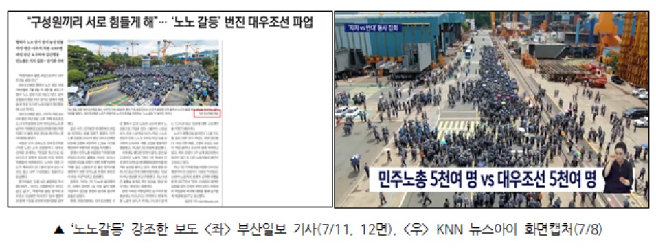 7월 8일, 대우조선 하청지회 파업을 지지하는 노동자들과 반대하는 노동자들의 대규모 집회가 동시에 벌어지면서 지역언론은 파업 소식에 주목했다. 특히 부산일보와 KNN은 대우조선 ‘원청’ 노조와 ‘하청지회’의 갈등을 부각했다. <“구성원끼리 서로 힘들게 해”… ‘노노 갈등’ 번진 대우조선 파업>(부산일보 12면, 7/11)에서는 “대우조선해양 협력사 노조 파업이 ‘노노 갈등’으로 치닫고 있다. 일부 조합원의 현장 무단 점거로 인해 생계에 위협을 받게 된 또 다른 노동자들이 집단행동에 나섰다”며 대우조선해양 측이 제공한 하청지회 파업을 반대하는 집회의 사진만 크게 게재했다. 이어 <대우조선해양 ‘노노 갈등’ 격화…원청 노조, 금속노조 탈퇴 추진>(부산일보 온라인, 7/13) 기사는 ‘노노 갈등’이 “점입가경”이라는 표현을 쓰며 대우조선 원청노조의 민주노총 금속노조를 탈퇴하려는 움직임을 강조했다.