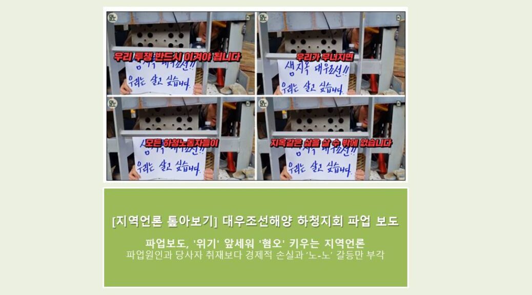파업이 장기화되면서 대우조선 선박 진수 작업은 한 달째 멈췄고, 농성 중인 노동자들의 건강도 악화하고 있다. 14일 정부는 “위법한 행위가 계속된다면 법과 원칙에 따라 엄정히 대응할 수밖에 없다”고 밝혔고, 시민사회는 ‘희망버스’를 통해 파업지지 소식을 알리기도 했다. 새로운 국면을 맞게 된 대우조선해양 하청지회 파업, 지역언론이 기업 위기만을 강조하며 파업과 노동자에 대한 ‘혐오’를 부추기기보단 ‘같이 살자’는 상생의 관점으로 경제(기업)와 노동을 대등하게 보도할 것을 기대해본다. <끝>.