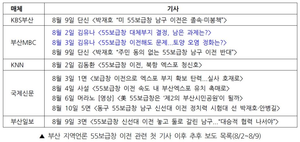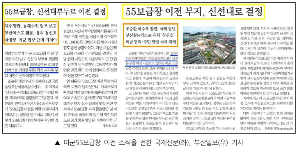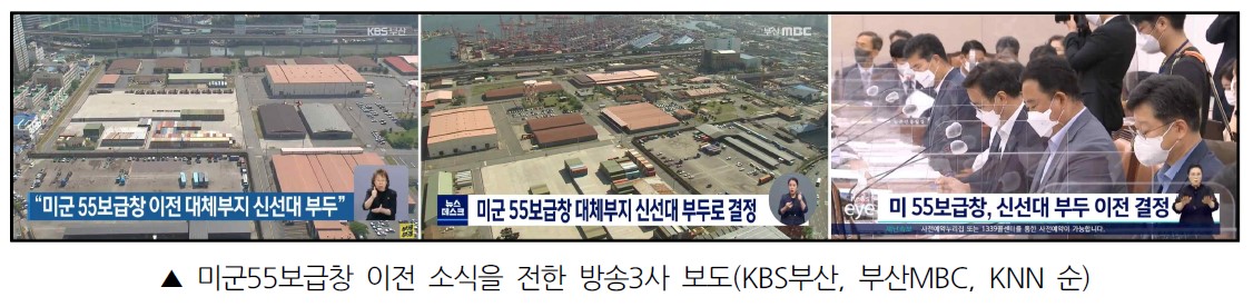 방송3사는 이 소식을 모두 8월 1일 단신으로 전했다. 보도 내용은 해수부가 미군55보급창 이전 대체부지로 신선대 부두를 결정했으며, 이는 부산시가 미군55보급창 부지를 2030부산월드엑스포 개최 장소로 활용하기 위해 국방부에 이전을 요구, 해수부가 대체 부지를 검토한 결과라는 것이었다.