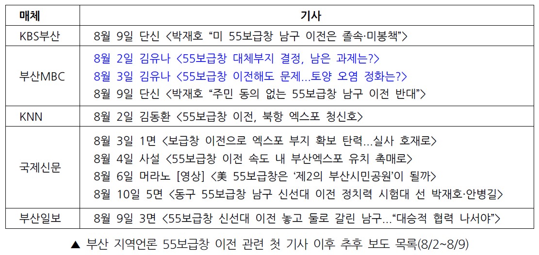국제신문과 부산일보는 해당 소식을 8월 2일자 신문 1면에 배치했다. 관심은 2030부산월드엑스포에 맞춰졌다. 두 신문 모두 나란히 중간제목에서 엑스포 유치에 청신호가 켜졌다며, 55보급창 이전에 따른 여론의 관심을 2030부산월드엑스포로 집중시켰다. 이어 국제신문은 미군과의 협상을, 부산일보는 여기에 더해 주민의 반발을 다음 극복 과제로 지목했다.