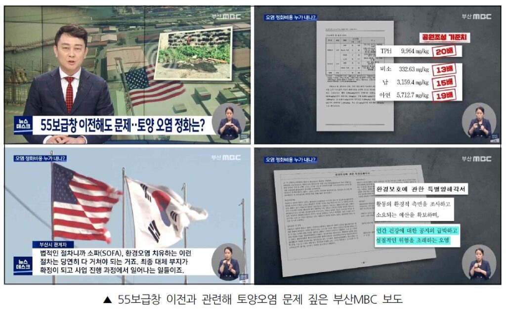 그런 가운데 부산MBC의 보도가 눈에 띄었다. 부산MBC는 앞서 5월 24일 뉴스데스크 첫 소식으로 <부산 미군 55보급창도 기름·중금속 ‘범벅’>을 전했다. 55보급창 토양오염 조사 문건을 단독으로 입수해 살펴본 내용이었다. 5월의 단독 보도를 디딤돌 삼아, 이번 해양수산부 업무보고에서 55보급창 이전에 대한 논의가 나오자 토양오염에 대한 조사, 정화 계획뿐 아니라 정화비 분담 및 토양오염 문제 해결 주체를 주요 사회 의제로 설정했다.