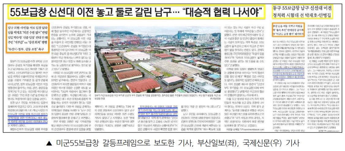 국제신문 <동구 55보급창 남구 신선대 이전 정치력 시험대 선 박재호·안병길>(8/10, 5면)은 미군 55보급창 이전에 적극적인 안병길(서동) 의원과 신선대부두로의 이전을 반대하는 박재호(남을) 의원 간 대결 구도를 형성했다. 이번 논의가 다음 총선을 앞둔 두 의원의 정치력을 입증하는 시험대가 될 것이라고 분석했다.