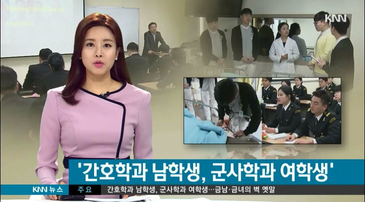 최근에 지역방송 3사의 뉴스에는 같은 리포트가 등장했습니다. 동명대학교 군사학과에 여학생이 입학하고 간호학과에 남학생이 입학하면서 학과와 직업에 남녀 구분이 사라진다는 내용이었습니다. 이 기사는 KNN이 3월 8일에 <간호학과 남학생, 군사학과 여학생>이라고 제일 먼저 리포트로 냈구요, 17일에 KBS부산이 <남녀 구분은 없다>, 이어서 18일에는 부산MBC가 <금남 금녀 벽 사라진다>는 제목으로 보도했습니다.