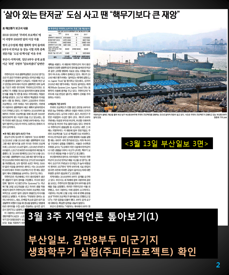 오래 전부터 민중연대가 생화학실험을 한다는 의혹을 제기하면서 반대운동을 해왔는데요, 최근 부산일보가 미 국방부 프로그램 예산평가서에서 주피터 프로젝트를 찾아냈습니다. 지난 13일에 올해 미 국방부가 우리 돈으로 40억 원을 들여서 생화학전 과제를 수행할 계획이라고 보도를 했는데요, 추가 보도에 따르면 내년 1분기에도 주피터 프로젝트를 계속 추진한다는 계획이 추가 확인됐다고 합니다. 이 생화학실험은 탄저균이나 페스트균을 이용하는 겁니다. 2015년에 평택 미 오산공군기지에서 실험을 위해서 살아있는 탄저균을 배달한 일이 있었죠. 자칫 잘못해서 사고가 나면 주변 주민들의 안전과 생명이 위협받을 수 있는 일이라, 현재 지역구 국회의원과 구청장, 여야, 시민단체 할 것 없이 한 목소리로 부산시민의 생명과 안전을 위협하는 생화학 실험을 폐기하라고 주장하고 있습니다.