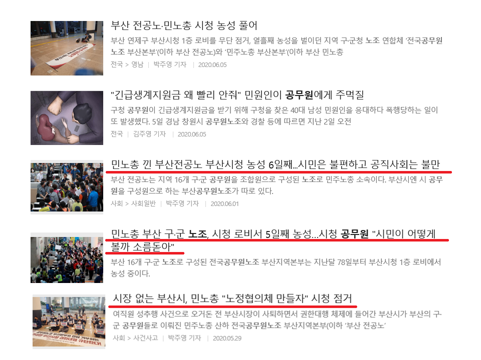 전국공무원노조 애초 주장이 ‘협의체’ 구성이었으므로 6월 초 기사는 ‘협의체’ 구성이 불가능하다는 데 초점을 맞추는 것이 일견 타당합니다. 하지만 농성 기간 중 나온 기사를 종합해봐도 이번 갈등이 불거진 원인과 배경을 충분히 해설하기는 부족합니다. 시 관계자의 해명으로 끝맺음하거나 부산시 소속 공무원들이 온라인 게시판에 쓴 글을 인용하여 시청 공무원과 구·군 공무원 간의 노-노 갈등 구도를 부각하기도 했습니다. 시민들은 ‘냉담’, ‘싸늘’하기만 했을까요. 코로나19로 업무가 가중된 의료진을 걱정하고 감사하는 만큼 민원을 접수하고 그에 맞는 지원책을 연결하느라 수고하는 공무원의 수고로움을 헤아리는 시민도 있을 법 하지만 그런 목소리는 담기지 않았습니다.