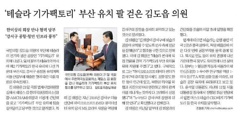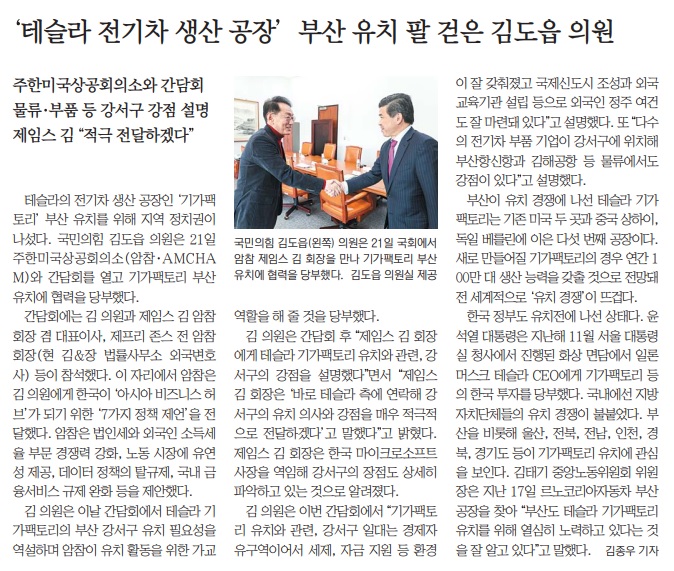 국제신문 <‘테슬라 기가팩토리’ 부산 유치 팔 걷은 김도읍 의원>(2/22, 5면)