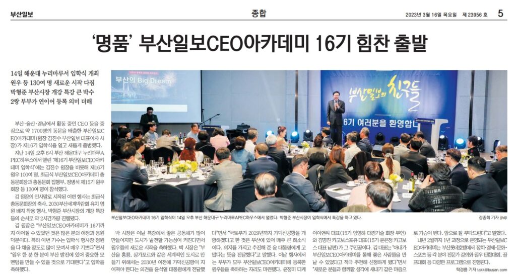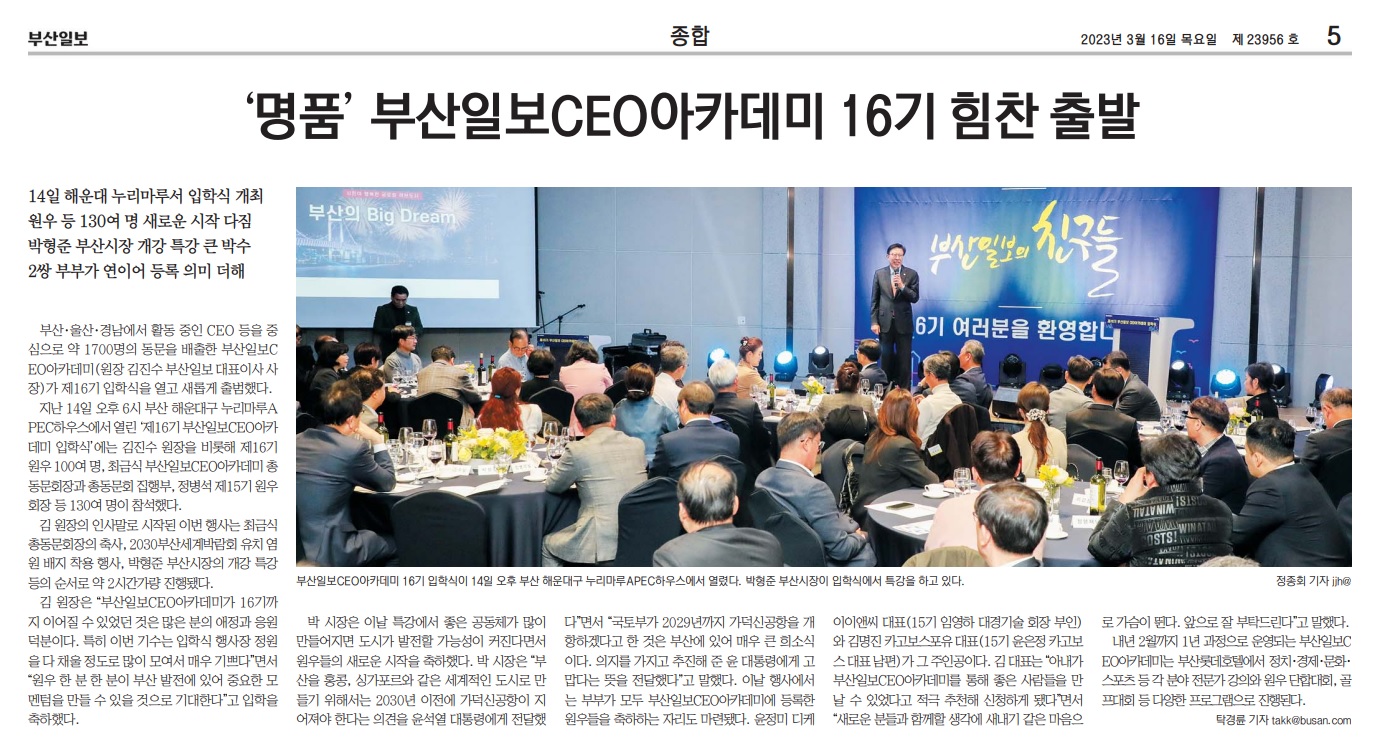 부산일보는 3월 16일 5면 머릿기사로 <‘명품’ 부산일보 CEO아카데미 16기 힘찬 출발>를 실었다. ‘부산일보CEO아카데미’는 부산일보사가 진행하는 최고경영자 대상 강좌사업이다. 기사는 CEO아카데미 16기 입학식 현장을 소개하며 특강에 나선 박형준 부산시장의 주요 발언, 그리고 입학식에 참석한 원우 등을 소개하며 성황리에 진행되었다고 보도했다. 1년 과정으로 진행되는 CEO아카데미의 주요 강좌와 단합 프로그램까지 소개했다.