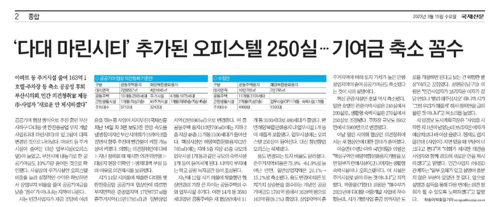 <‘다대 마린시티’ 추가된 오피스텔 250실..기여금 축소 꼼수>(국제신문, 3/15, 2면)