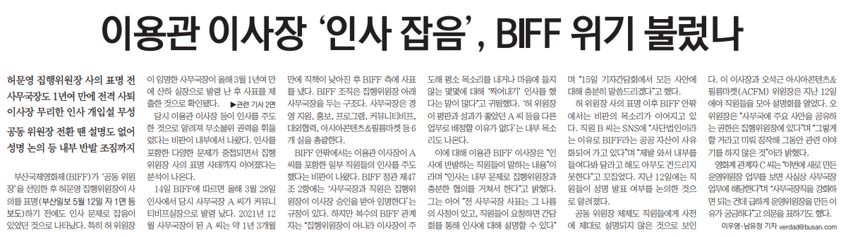 <‘이용관을 위한 BIFF’ 막을 견제 장치 없었다>(부산일보, 5/17, 2면)