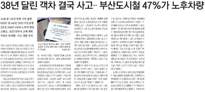 최근 전동차 노후화로 인한 사고가 반복적으로 발생하고 있다. 자칫 대형사고로 이어질 수 있는 문제이므로 지역 언론의 적극적인 관심을 기대한다.