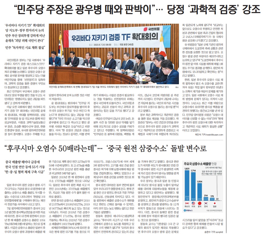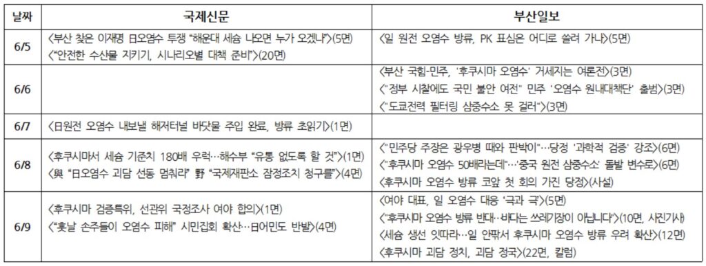 국제신문도 여야 주장을 그대로 전달하며 후쿠시마 오염수 방류 문제를 정쟁화했다[<부산 찾은 이재명 日오염수 투쟁 “해운대 세슘 나오면 누가 오겠나”>(6/5, 5면), <與 “日오염수 괴담 선동 멈춰라” 野 “국제재판소 잠정조치 청구를”>(6/8, 4면)]. 이와 함께 수협중앙회 회장 인터뷰와 시민 집회 소식 등 지역 수산업계와 시민사회 입장을 전하기도 했다.