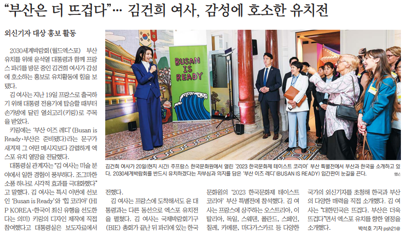 <“부산은 더 뜨겁다”… 김건희 여사, 감성에 호소한 유치전>(부산일보, 6/22, 2면)