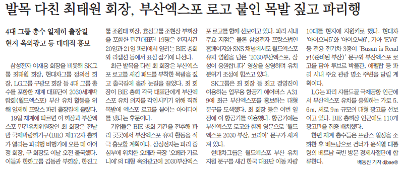 <발목 다친 최태원 회장, 부산엑스포 로고 붙인 목발 짚고 파리행>(부산일보, 6/20, 2면)