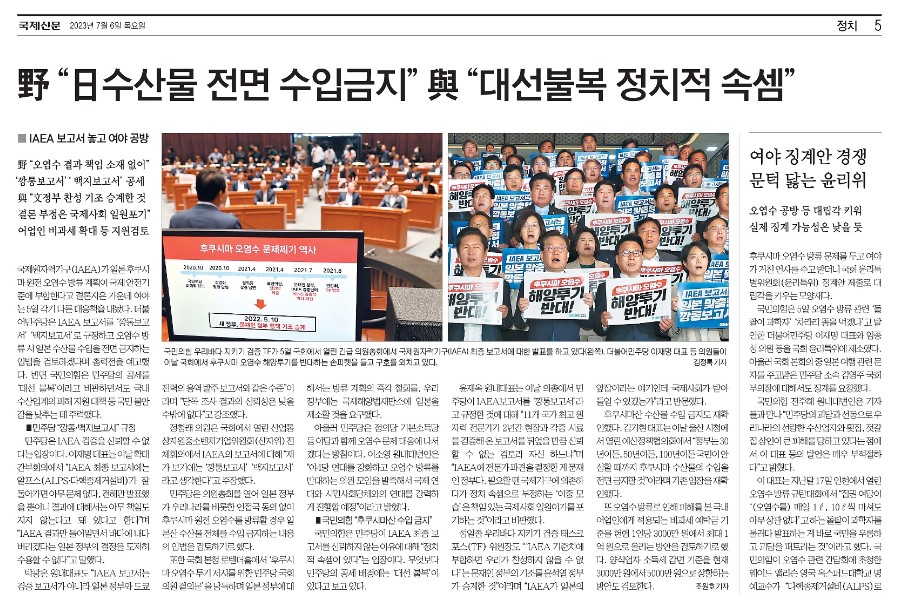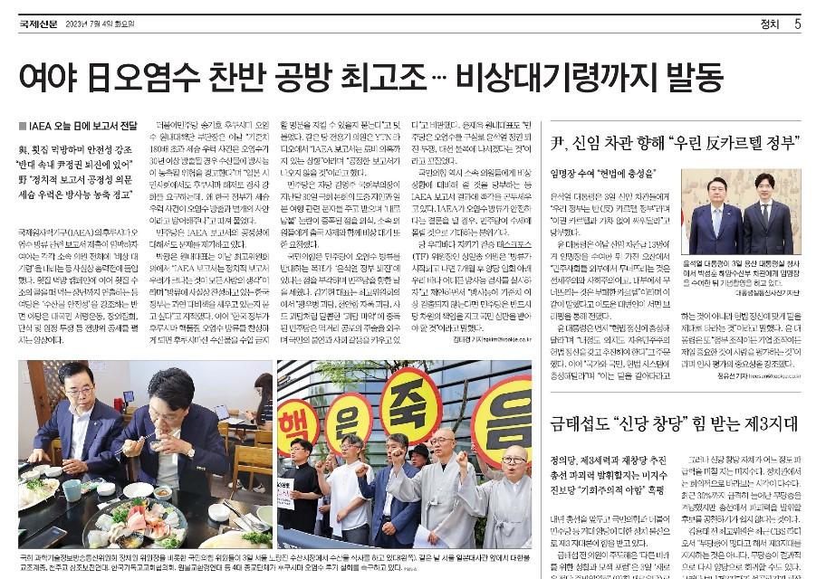 한편 정치면을 통해서는 정치권의 오염수 방류 찬반에 대해 대결구도로 보도하는 경향을 보였다[<“방류 계획 철저히 검증” vs “일본 수산물 수입 금지”>(부산일보, 7/6, 3면), <여야 일오염수 찬반 공방 최고조..비상대기령까지 발동>(국제신문, 7/4, 5면), <“IAEA 못 믿겠다” “괴담 멈추자” 둘로 쪼개진 대한민국>(국제신문, 7/5, 3면), <야 “일수산물 전면 수입금지” 여 “대선불복 정치적 속셈”>(국제신문, 7/6, 5면)]. ‘여론 선점’이나 ‘공세’, ‘공방’, ‘논란’, ‘둘로 쪼개진’과 같은 단어를 반복적으로 사용하며, 오염수 방류 문제를 ‘정쟁’으로 보도했다. 지역언론은 국민의 불안과 우려, 정치권의 합리적 문제제기를 대결구도로 보도하기보다는 다양한 의견을 존중하는 ‘공존’의 관점으로 보도해 주길 기대한다.
