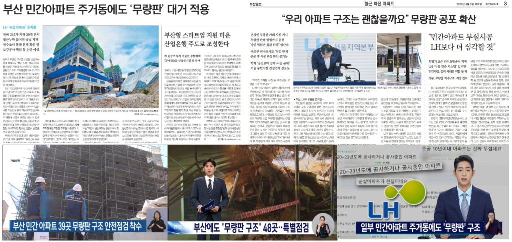 시공비와 공사기간을 줄일 수 있어 2017년부터 국내 아파트에 많이 도입된 ‘무량판 공법’에 대한 불안감이 확산되고 있음을 전하며[<우리집도 혹시 무량판? 도면 찾아나선 주민들… 불안 확산>(국제신문, 8/2, 2면), <“우리 아파트 구조는 괜찮을까요” 무량판 공포 확산>(부산일보, 8/3, 3면)], 무량판 구조 자체의 위험성보다는 건설 현장에서 무너진 원칙이 문제를 일으켰음을 지적하기도 했다[<설계·시공·감리 총체적 부실 ‘무량판 공포’ 불러>(국제신문, 8/2, 3면)]. 이 과정에서 설계부터 문제인데 시공사에게만 책임 묻고 있다는 지역 중소건설사의 불만의 목소리도 함께 전달했다[<가뜩이나 어려운데… 전수조사에 건설업계 비상>(국제신문, 8/2, 3면), <‘순살 아파트’ 전수조사 방침에 건설업계 ‘전전긍긍’>(부산일보, 8/2, 2면), <부산시 ‘무량판 구조’ 특별점검…업계 긴장>(KBS부산, 8/3)].
