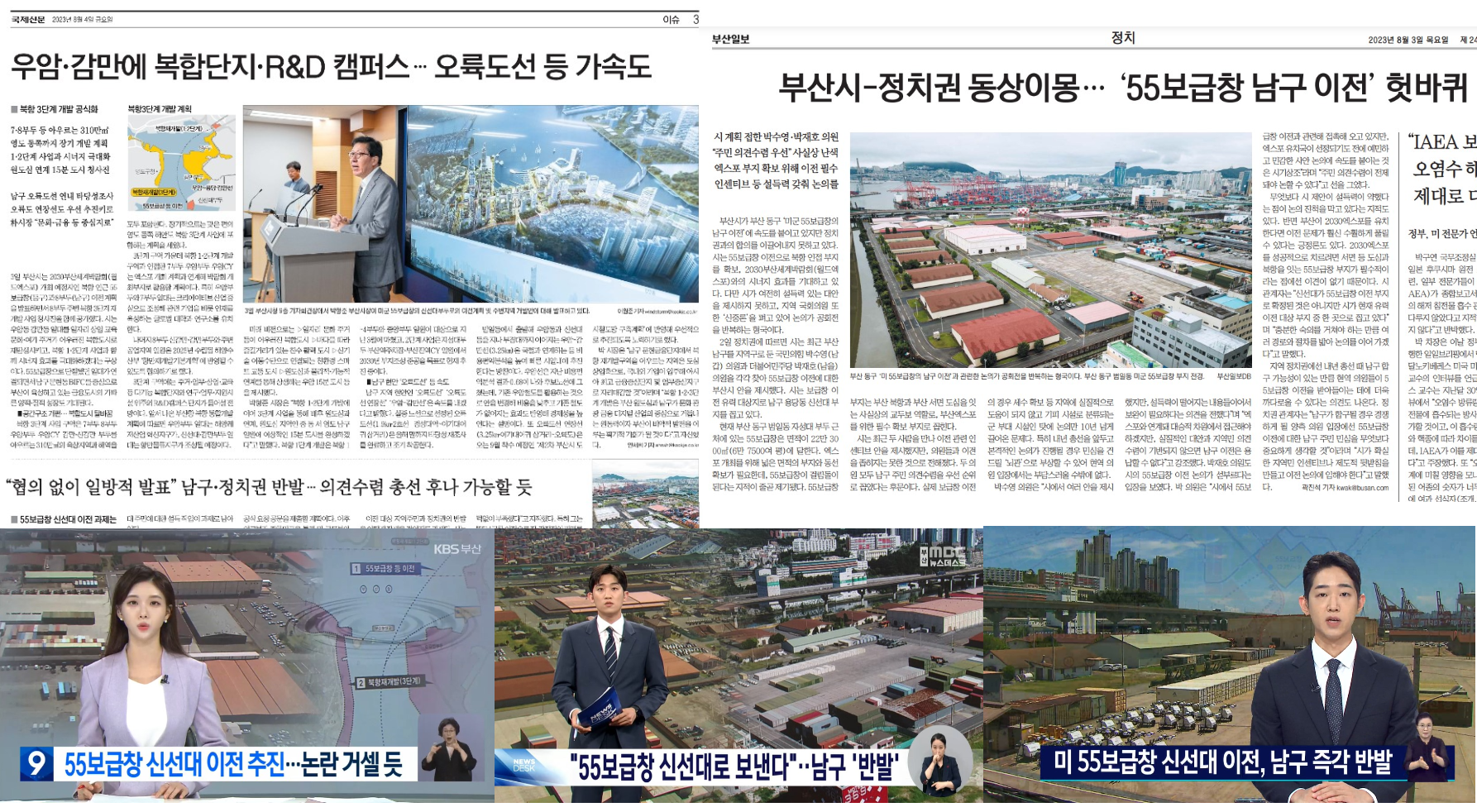 지역언론도 55보급창 이전 문제를 주요하게 보도했다. 지역신문은 부산시의 이전 계획을 상세히 전했다[<55보급창·8부두 2029년까지 비운다>(국제신문, 8/4, 1면), <‘단절된 땅’ 시민 품 안기지만 군사시설 기피 주민 반발 ‘난관’>(부산일보, 8/4, 2면)]. 특히 국제신문은 <우암·감만에 복합단지·R&D 캠퍼스…오륙도선 등 가속도>(8/4, 3면)을 통해 우암동과 감만동 일대가 일자리·문화·여가·주거가 어우러진 복합도시로 재탄생될 것이며, 55보급창으로 단절됐던 일대가 연결되면서 남구 문현동 BIFC를 중심으로 부산이 금융도시로의 성장할 것을 기대했다.