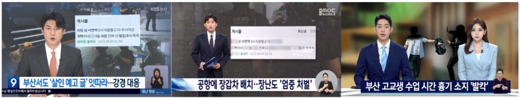 지역방송은 한 주간 2~3건의 기사를 내보내, 지역신문보다 비교적 적은 관심을 보였다. KBS부산과 부산MBC는 부산에서도 범죄를 예고하는 글이 잇따라 올라오자 경찰이 강력 대응에 나섰다는 점을 알렸다[<부산서도 ‘살인 예고 글’ 잇따라…강경 대응>(KBS부산, 8/7), <공항에 장갑차 배치… 장난도 ‘엄중처벌’>(부산MBC, 8/7)]. KNN은 <부산 한 고교서 학생이 수업중 흉기 소지, 대피 소동>(8/8)을 통해 부산의 한 고등학생이 학생과 교사를 흉기로 위협한 사건을 보도했다. 대부분 사건 소식을 전달하고 정부의 대응을 설명하는 기사였다.