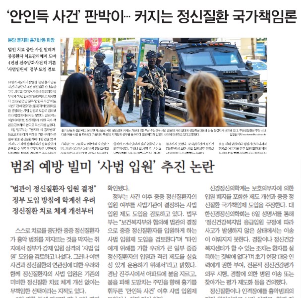 한편, 국제신문은 이번 사건의 대책으로 중증 정신질환자의 입원 여부를 사법기관이 결정하는 사법 입원제 도입이 필요하다고 강조했는데[<‘안인득 사건’ 판박이…커지는 정신질환 국가책임론>(8/7. 1면)], 이 같은 대책은 정신장애인을 잠재적 범죄자로 낙인찍는 것이기에 신중히 논의가 이뤄져야 한다. 부산일보는 이번 범죄를 정신질환과 직접 연관시키는 것은 무리라며 입원이나 재활 관련 시스템에 대한 투자가 없는 상황에서 사법 입원만 추진하는 것은 무책임하다는 전문가 의견을 인용하기도 했다[<범죄 예방 빌미 ‘사법 입원’ 추진 논란>(8/7, 2면)]. 단순히 정신질환을 앓던 자가 범죄를 저지른 일부 사건을 사례로 들어 사법 입원제가 필요하다고 주장하기보다는 이번 사건을 다각도에서 살펴봐 건설적인 대책을 마련할 수 있도록 언론이 제 역할을 다해야 할 것이다. 아울러 정부가 강력 대응에 나서겠다고 한 것과 경찰의 장갑차 배치나 무고한 시민 체포 등 과잉 대응에 있어 문제가 없는지 언론이 살피길 바란다.
