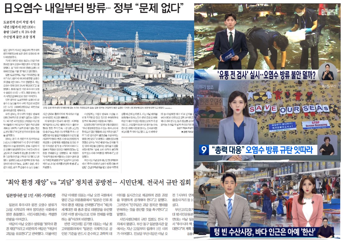 지역언론은 주요 지면과 메인 뉴스를 통해 해당 소식을 전했다. 일본 정부의 방류 계획을 전하면서 일본의 핵 오염수 방류에 “과학적ㆍ기술적 문제가 없다”는 우리 정부의 입장도 전달했다[<日오염수 내일부터 방류… 정부 “문제 없다”>(국제신문, 8/23, 1면), <일 내일 오염수 방류… 정부 “과학적 문제 없다”>(부산일보, 8/23, 1면)]. 아울러 수산물이 유통되기 전 방사능 검사에 나서겠다는 우리 정부의 대책을 소개하기도 했다[<해수부, 일본산 수산물 취급업체 3차례 이상 ‘투 트랙 점검’>(국제신문, 8/23, 2면), <수산물 ‘유통 전 신속 검사’ … 방사능 검출 땐 위판 중단>(부산일보, 8/23, 3면)].