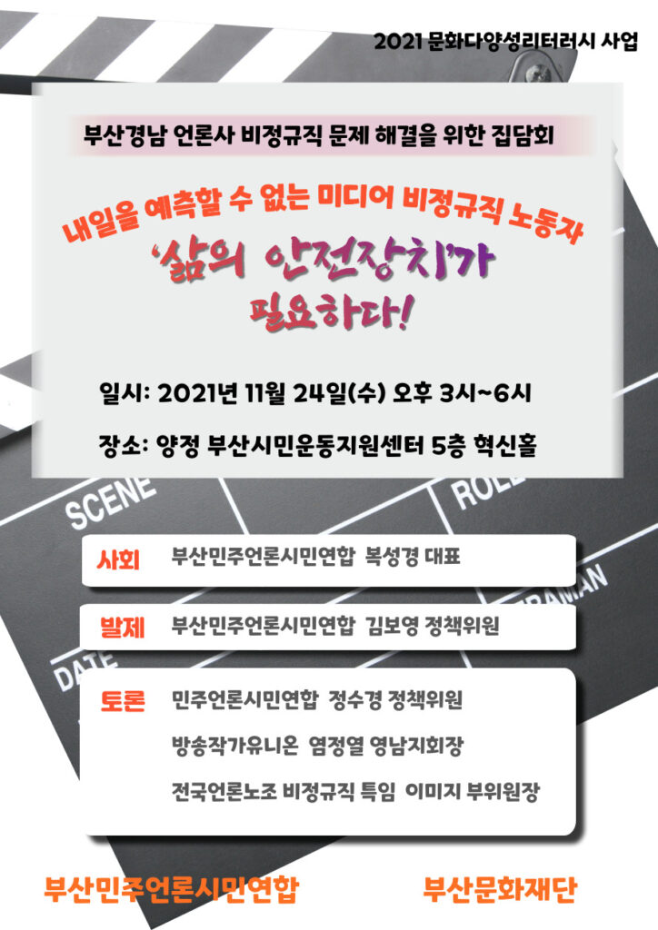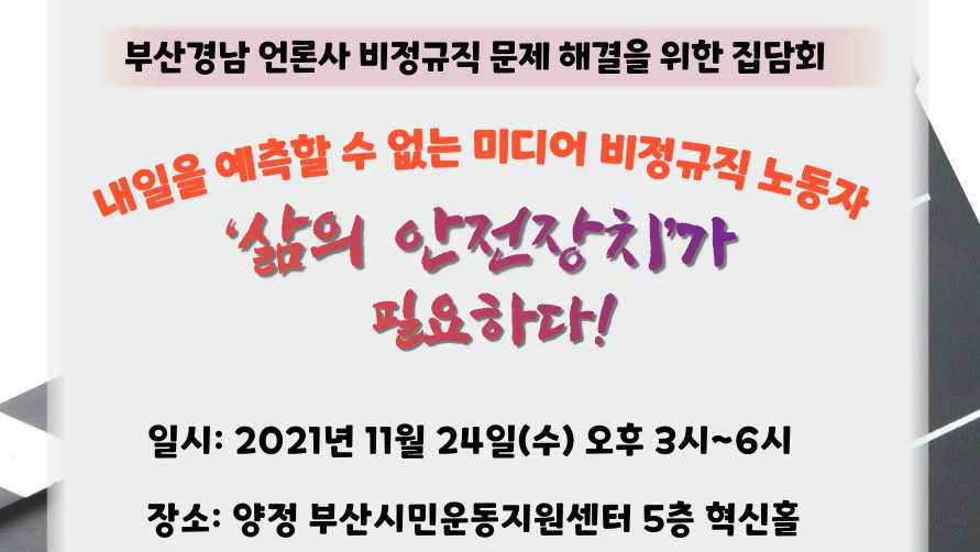 이에 부산민주언론시민연합은 부산경남지역 언론사 비정규직 현황조사를 진행하였고, 이 조사를 바탕으로 지역 언론사 비정규직 문제를 공유하고 개선책을 모색하는 작은 집담회 자리를 마련했습니다.