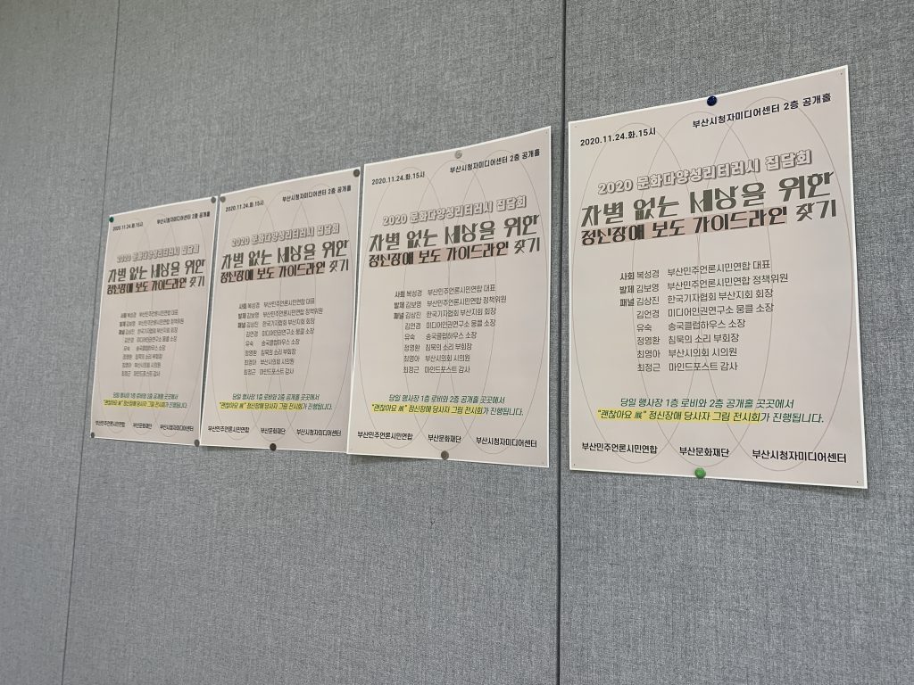 부산민언련은 지난 11월 24일 <차별 없는 세상을 위한 정신장애 보도 가이드라인 찾기> 집담회를 개최했습니다. 정신장애 관련 보도 모니터링, 당사자 미디어비평 교육 등을 통해 마련한 <정신장애 보도 가이드라인(안)>을 공유하는 자리였는데요, 당사자부터 관련 기관, 언론사 그리고 정신장애 보도의 문제를 개선하려는 시민사회, 시의원까지 다양한 토론자와 함께 정신장애 보도 가이드라인에 대한 제언을 모았습니다.