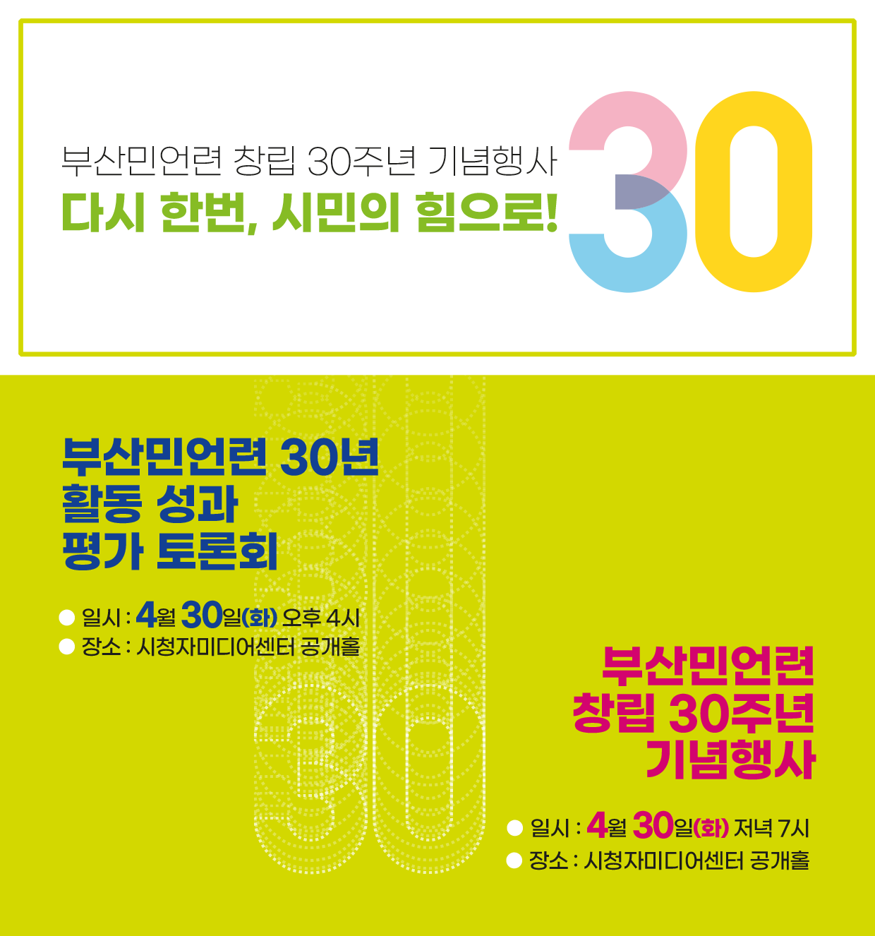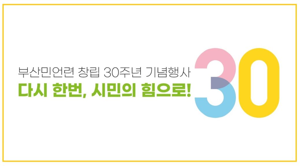 2024년 4월 30일, 부산민언련이 서른 번째 생일을 맞이합니다. 30년 긴 세월 부산민언련을 지키고, 시민의 언론개혁 운동에 함께해주신 회원님들, 끈끈한 연대로 함께 한 언론인들, 시민사회 활동가 모든 분들을 ‘창립 30주년 기념행사’에 초대합니다.
