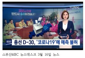 부산MBC는 3월 16일 <총선 D-30, ‘코로나19’에 예측 불허>에서 총선 한 달 앞둔 각 당의 총선 전략을 주요하게 보도했다. 더불어민주당에 대해 ‘코로나19 극복’을 전면에 내세워, 총선에서 평가받겠다는 전략이라며 ‘국가적 위기를 하루빨리 극복하기 위해서 민주당에 힘실어 달라’ 라고 김영춘 후보 발언을 싣고, ‘20대 총선에 이어 의미있는 의석 확보로 지역주의를 한 단계 더 극복하는 게 목표’라고 보도했다. 이날 더불어민주당 후보들이 재난기본소득 100만원 지급을 청와대에 요청했지만 이 내용은 빼고 총선 전략만 전해 정책이 잘 드러나지 않았다. 미래통합당은 서병수 후보의 “길바닥 뒤져 생필품 된 마스크 사야하는 지경, 문재인 정권은 무능, 부패한 정권”이라는 원색적인 비난을 그대로 전했고 ‘코로나19 대응 등 ‘정권 심판론’을 내세워 보수텃밭을 온전히 되찾는다는 계획’이라며 지역주의 조장 발언을 그대로 전달하기도 했다. 정의당과 민생당, 민중당에 대해서는 총선 활동을 소개하지는 않은 채, ‘일찌감치 후보를 확정하고, 본격 선거전을 준비 중이지만 거대 양당 진영 논리와 코로나19 이슈에 묻혀 선거전략 마련에 어려움을 겪고 있다’고만 보도했다. 기사는 마무리 멘트로 코로나19 여파로 선거운동이 제약되면서 정보 접근이 차단되고 정책, 인물 경쟁은 더 힘들어지고 있다고 우려했지만, 정작 부산MBC에서는 정책·인물 검증을 위한 정보는 나오지 않은 채 부정적인 면만 강조했다.