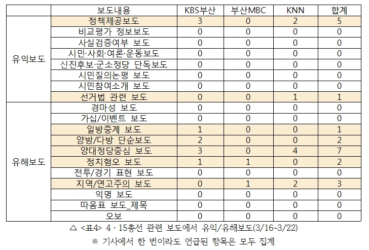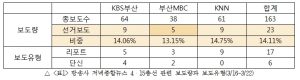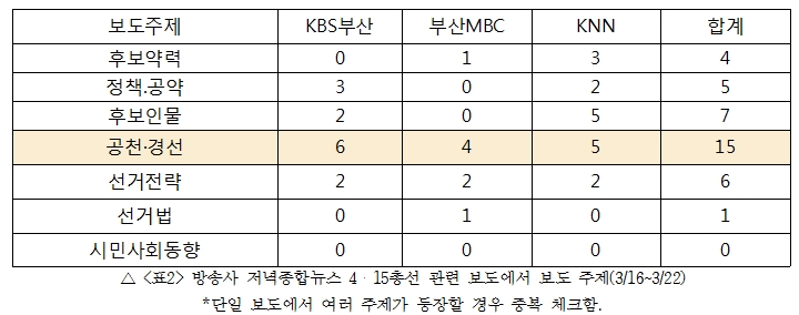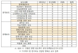 부산2020총선미디어감시연대지부는 부산지역 신문과 지상파방송 메인뉴스(국제신문, 부산일보, KBS부산, 부산MBC, KNN 저녁종합뉴스)를 주 대상으로 선거보도 모니터링을 진행하고 있습니다. 다음은 지역방송 3사 저녁종합뉴스를 대상으로 3월 16일(월)~22일(일)까지 진행한 방송보도 모니터 보고서입니다.