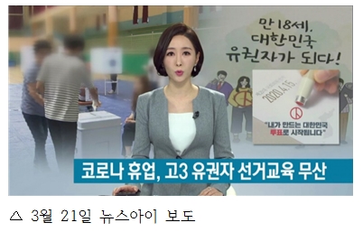 KNN 3월 21일 <코로나 휴업, 고3 유권자 선거교육 무산>에서는 만 18세 고3 유권자들에 대한 대면 교육이 무산된 소식을 전했다. 올해 처음 시행되는 만 18세 유권자 문제를 환기시킨 점에서 의미있었다. 다만, 선관위 교육이 무산됐다는 걸 주요하게 보도하기보다 선관위가 고3을 대상으로 어떤 교육을 준비했는지 내용을 소개하거나 18세 투표 참여 중요성을 강조했다면 더 좋았겠다는 아쉬움이 들었다. 준연동형비례대표제와 함께 처음 시행되는 제도인 만큼 만 18세 청소년 유권자 중심의 후속 보도가 나왔으면 한다.