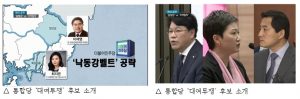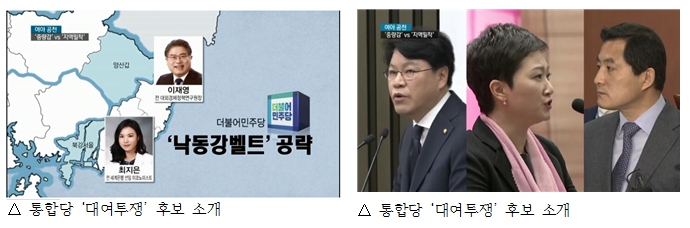 다만 더불어민주당에서는 낙동강벨트를 공략하는 인물이라며 국제경제전문가 최지은, 대북전문가 이재영 두 후보를 지도 위에 프로필 사진과 이름을 달아 그래픽으로 소개했다. 또 미래통합당 대여투쟁력 있는 후보로 장제원, 이언주, 박재출 후보를 언급하며 활동 영상을 실었다.