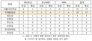 공천 보도는 3월 17일 KBS부산 <미래통합당 경선 결과 발표…전직 시의원 약진>, 부산MBC <부산 총선 대진표 윤곽>, KNN <미래통합당 4곳 빼고 PK공천 마무리>와 같이 미래통합당 공천 마무리 뉴스와 함께 경쟁하는 더불어민주당 후보를 소개했는데, 거대 양당 중심의 대결 구도 보도는 3주째 반복되는 형식이었다. 이런 가운데 3월 16일 KBS부산 <미래통합당 지역구 10곳 경선 결과 내일 발표>는 ‘미래통합당 경선 결과가 내일 나온다’며 예고까지 했다. 선거보도가 절대적으로 부족한 상황에서 필요한 보도였는지 되묻게 된다.