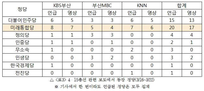 지난 모니터 기간에 비하면 언급된 정당 수가 늘어나긴 했지만 비중면에서는 차이가 컸다. 예시로 3월 17일 부산MBC <부산 총선 대진표 윤곽>은 그간 거의 언급되지 않았던 정의당을 비롯하여 소수 정당을 언급했지만, 주요 내용은 거대 양당 중심의 후보 대결 내용이었고 전문가의 선거전략 분석도 양당에 국한됐다. 소수 정당 관련해서는 ‘정의당과 민생당은 추가 공모하고 있고 10명을 목표로 하고 있다’는 정도만 언급하는 데 그쳤다. 양당중심 보도에서 벗어나 소수정당의 정보를 점차 늘려 유권자에게 다양한 정보를 제공하는 것이 시급하다.