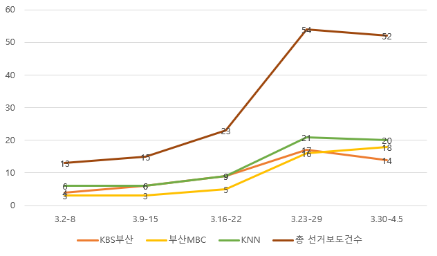 3월 마지막 주~4월 첫 주(이하 4월 첫 주) 지역 방송3사의 총 보도량은 178건이고 이중 선거보도는 52(29.2%)건이다. 3월 마지막 주 선거보도 54(27.3%)건 보다는 2건 적은 수치다. 모니터 이후 선거보도는 계속 증가했는데, 선거 열흘 앞두고 오히려 조금 줄었다.(그림1 참조) 지난 주에 이어 4월 첫 주에도 방송 3사 모두 기획보도를 이어가 기획보도 비중이 높았다. KBS부산이 50%로 가장 높았고, 부산MBC와 KNN이 각각 22.2%와 15.0%였다. 기획보도량은 많았지만 정책·공약 단순 나열과 지역 구도, 선거 전략 중심 보도 행태도 그대로 이어져 유권자 판단에 유용한 정보를 제공하는데는 한계가 있었다.