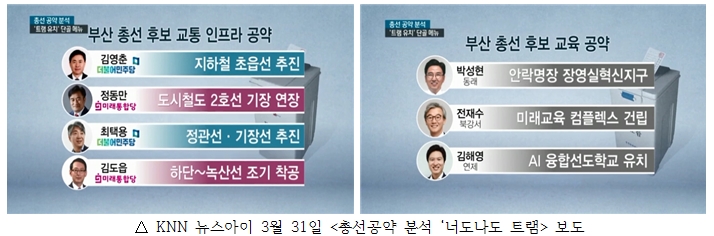 정책 보도 중에서는 먼저 KNN의 3월 31일 <총선공약 분석 ‘너도나도 트램’>이 눈에 띄었다. 후보들이 1호 공약으로 트램을 비롯한 교통 공약과 교육 공약을 많이 들고 나왔다고 소개했다. 이 분야에 해당하는 후보들의 공약을 한 눈에 알 수 있게 제시한 점은 유용했지만 ‘분석’을 하겠다는 리포트 제목과는 달리 서로 비교하거나 내용을 들여다보지 않고 15개나 되는 공약을 죽 나열하기만 한 점은 아쉽다.