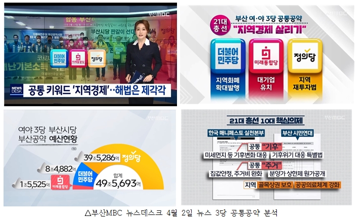 부산MBC 보도는 세 당의 정책을 비교 분석하고 개별 후보의 공약 준비 정도, 유권자 의제가 얼마나 반영됐는지 검증을 시도해 돋보였고, 유권자에게 유용한 보도로 평가된다.