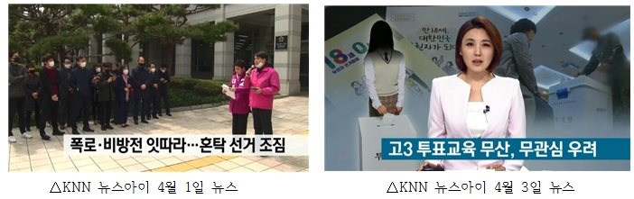 4월 5일 KNN <고3 투표교육 무산, 무관심 우려>에서는 코로나19 여파로 개학이 늦춰지면서 고3 유권자의 관심이 저조할까 우려했다. 그러면서 “저조한 투표율이나 부모님을 따라 투표하는 등의 상황도 우려되고 있습니다.” “신학기 적응과 입시 준비로 바쁜 고3이 적극적으로 투표에 참여할지는 미지수입니다.”라며 만18세 유권자가 소극적일 것으로 전망했다. 고3 유권자에게 투표의 의미와 투표 방법 등을 적극 알리는 것이 중요한 시기에 투표 참여를 독려하기 보다 부모님을 따라 투표할 것부터 우려하는 것은 고3 유권자를 무시하는 행태로 읽힌다. 한편, 만18세 유권자 중 고등학교에 재학중이지 않은 이들도 있을텐데, 무조건 ‘고3’, ‘교복민심’으로 지칭함으로써 일부 유권자에게는 소외감을 줄 수도 있음을 유의해야 할 것이다.