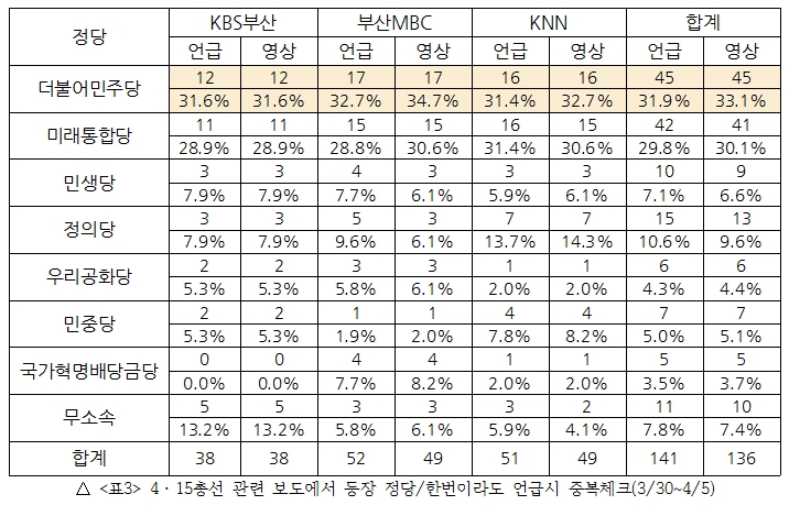 방송 3사의 정당별 언급 빈도는 더불어민주당이 45건으로 가장 많았고, 미래통합당 41건, 정의당 13건, 무소속 10건이었다. 이어 무소속 10건, 민생당 9건, 민중당 7건, 우리공화당 6건, 국가혁명배당금당 5건 순으로 등장했다. 거대 양당을 합하면 60%으로 여전히 언급이 가장 많았다. 언급 횟수도 많았지만 정책, 공약도 거대 양당 위주로만 보도해 소수 정당은 정책을 알릴 기회를 얻지 못했다. 지역구 출마자 수가 적거나 관심이 적은 것을 감안하더라도 기획 기사에서 만이라도 적극적으로 보도했어야 했다.