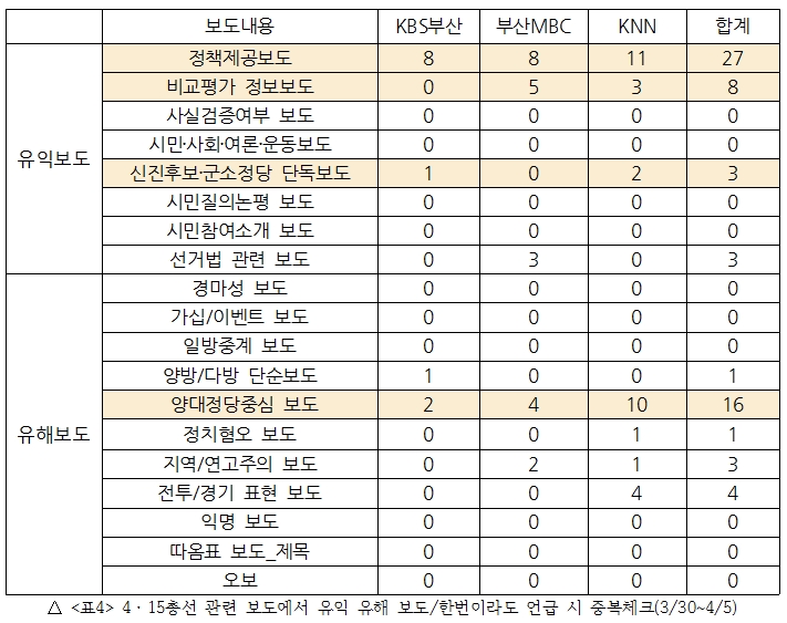 – 분석 대상 : KBS부산, 부산MBC, KNN 저녁종합뉴스 – 분석 기사 : 선거를 1번이라도 언급한 기사 또는 후보, 지지율, 지지층, 유세 등의 단어를 언급하여 선거와 연관됐다고 볼 수 있는 기사 |