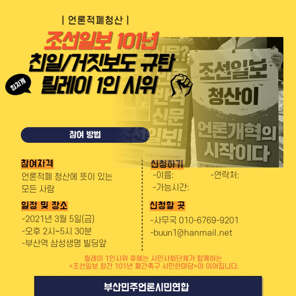 – 조선일보 101년 규탄 릴레이 1인시위에 온라인으로 함께해 주세요.