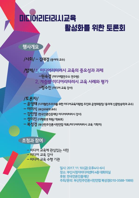 공지사항 [토론회] 미디어리터러시교육 활성화를 위한 토론회 개최 2017-10-31 bssiminnet Leave a comment 부산민언련이 미디어리터러시 활성화를 위한 토론회를 엽니다. 11월 10일 오후 4시 부산시청자미디어센터 대회의실에서 열립니다. 미디어리터러시교육은 학교와 사회, 때와 장소 가리지 않고 꾸준히 진행해야 합니다. 미디어교육 강사, 교육청, 교육기관의 관심과 참여 기대합니다.