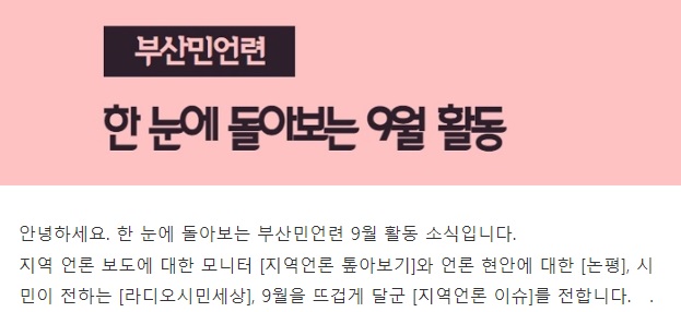 공지사항 한눈에 돌아보는 9월 활동 2021-10-01 bssiminnet Leave a comment 한눈에 돌아보는 부산민언련 9월 활동 소식 https://stib.ee/IJ44 9월 발표한 ‘지역언론 톺아보기’와 ‘논평’ , 지역 언론현안에 대한 논평, 시민이 제작하는 ‘라디오시민세상’ 을 담았습니다.