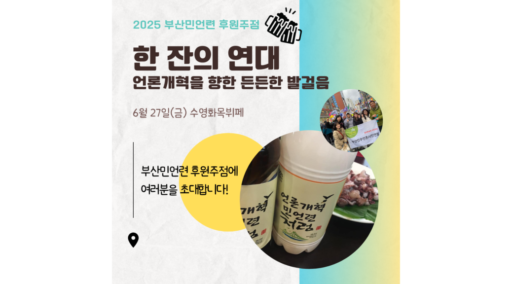‘한 잔의 연대’, 함께 웃고 나누는 자리에 당신을 초대합니다. 부산민언련이 올해는 후원주점을 준비하고 있습니다.언론 이야기부터 맛있는 안주, 반가운 사람들과의 수다까지. 오랜만에 편하게 마주 앉아 웃고 떠들 수 있는 자리를 만들고 싶었습니다. 우리가 지켜가고 싶은 언론, 그 이야기도 함께 나누고요. 서로를 격려하며 응원을 건네는, 그런 자리가 되었으면 합니다. 부산민언련은 지난 31년간 건강한 언론 환경을 만들기 위해 묵묵히 걸어왔습니다. 시민의 시선으로 언론을 감시하고, 시민의 권리를 지키기 위한 교육과 정책제안도 이어왔습니다. 그 모든 활동은 오직 시민 여러분의 지지와 후원로 가능했습니다. ![]() ![]() 이번 후원주점은 부산민언련의 걸음을 멈추지 않기 위해, 그리고 더 많은 시민과 뜻을 나누기 위해 마련한 자리입니다. 계엄과 내란, 대통령 탄핵이라는 비상한 시국을 지나며 언론의 책임과 개혁의 필요성을 이야기하는 시민들이 늘고 있습니다. 지역에서 유일하게 시민언론운동을 이어온 부산민언련. 그 활동이 지속되기 위해서는 여러분의 지지와 연대가 꼭 필요합니다. ![]() ![]() 🧭 참여 방법 안내 📍 6월 27일(금) 오후 4시 ~ 10시 📍 수영화목뷔페 (수영역 13번 출구) 🙌 함께하는 방법 -후원주점 참석하기 -지인에게 소식 전하기 -자원봉사·홍보로 손 보태기 –후원주점 티켓 구매로 마음 나누기 (3/5/10만 원권, 행사 당일 현금처럼 사용 가능) → 티켓 문의: 사무국장 박정희 010-6769-9201 –후원계좌 부산은행 101-2057-3814-04 (예금주: 부산민언련) ![]() 후원주점 홍보 영상보기>>> |