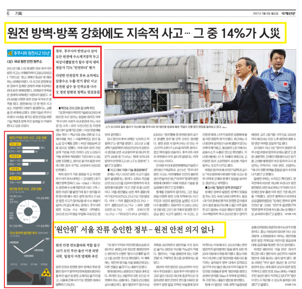 국제신문은 기획보도를 통해 2011년 3월 11일 후쿠시마 원전사고 발생 10년 이후, 국내 원전 26기(영구정지 원전 포함)에서 발생한 사고와 고장이 116건에 달하여 여전히 방사능 유출 위험과 사고 가능성이 있음을 알렸습니다. 이에 정부에 더욱 적극적인 원전 안전을 위한 기술 역량과 정책 추진 동력을 요구하는 한편, 세계 원전밀집지역인 동남권에 원전사고 시 신속한 대응이 필요함에도 불구하고 정부가 원전안전의 컨트롤타워인 원자력안전위원회의 서울 잔류를 승인한 점을 비판했습니다.